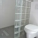 Duş, saç kurutma makinesi içeren özel bir banyo sunmaktadır.